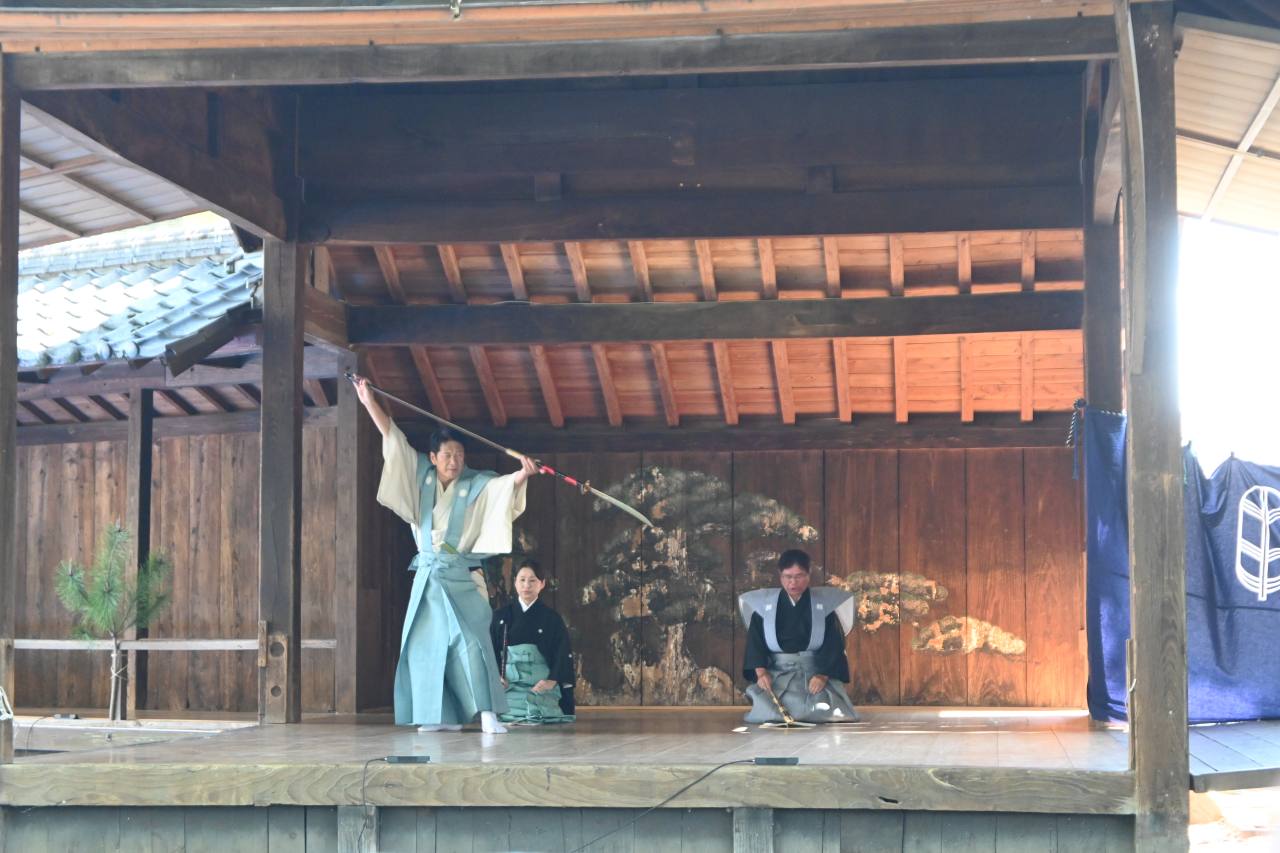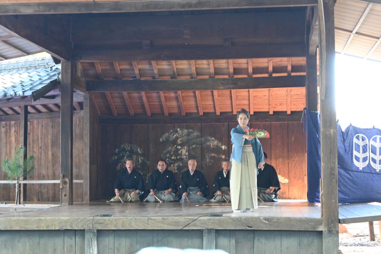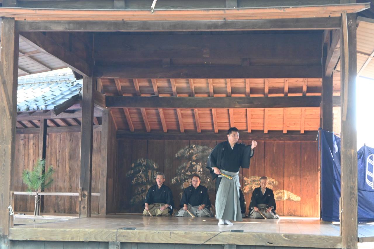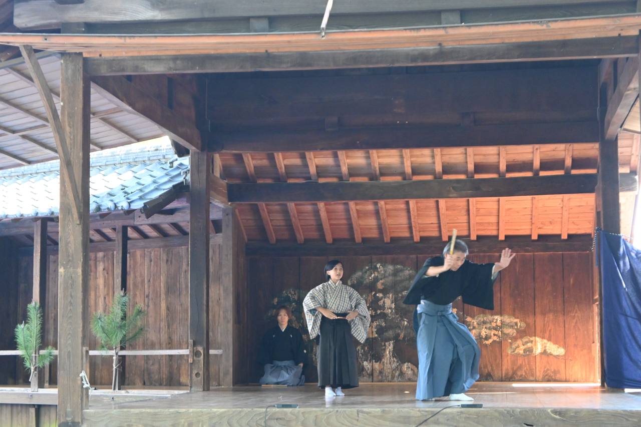 その後菊池神社による神事が執り行われたあと、菊池高等学校前にある熊本県指定有形民俗文化財「菊池松囃子能場」で、御松囃子御能保存会による御能が奉納されました。