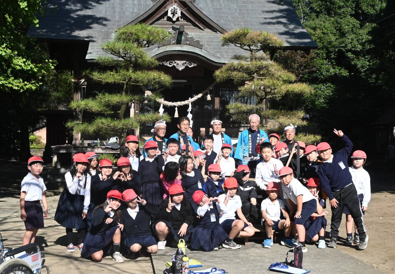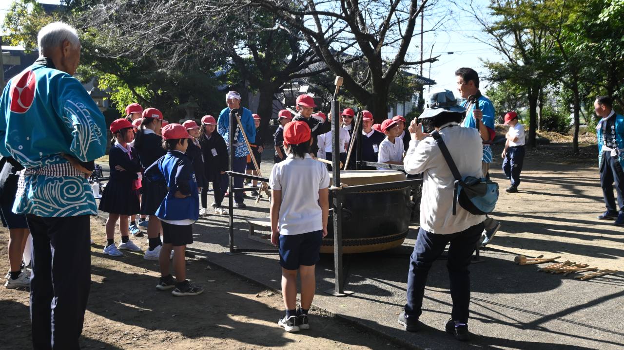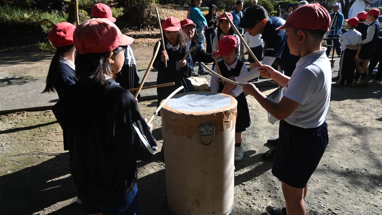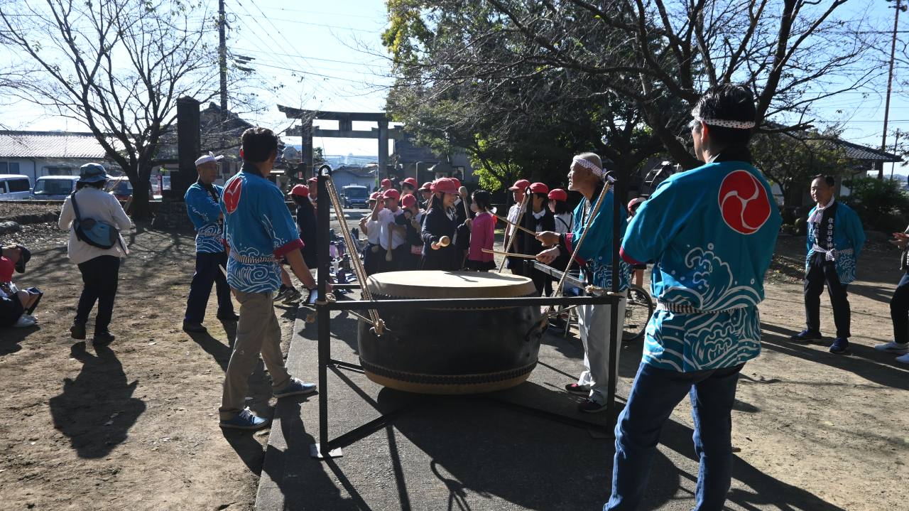 11月6日(木)、菊池市泗水町住吉の住吉日吉神社に泗水東小学校3年生35名が訪れ、住吉日吉神社雨乞太鼓(あまごいだいこ)の体験学習(総合的な学習の時間)が行われました。