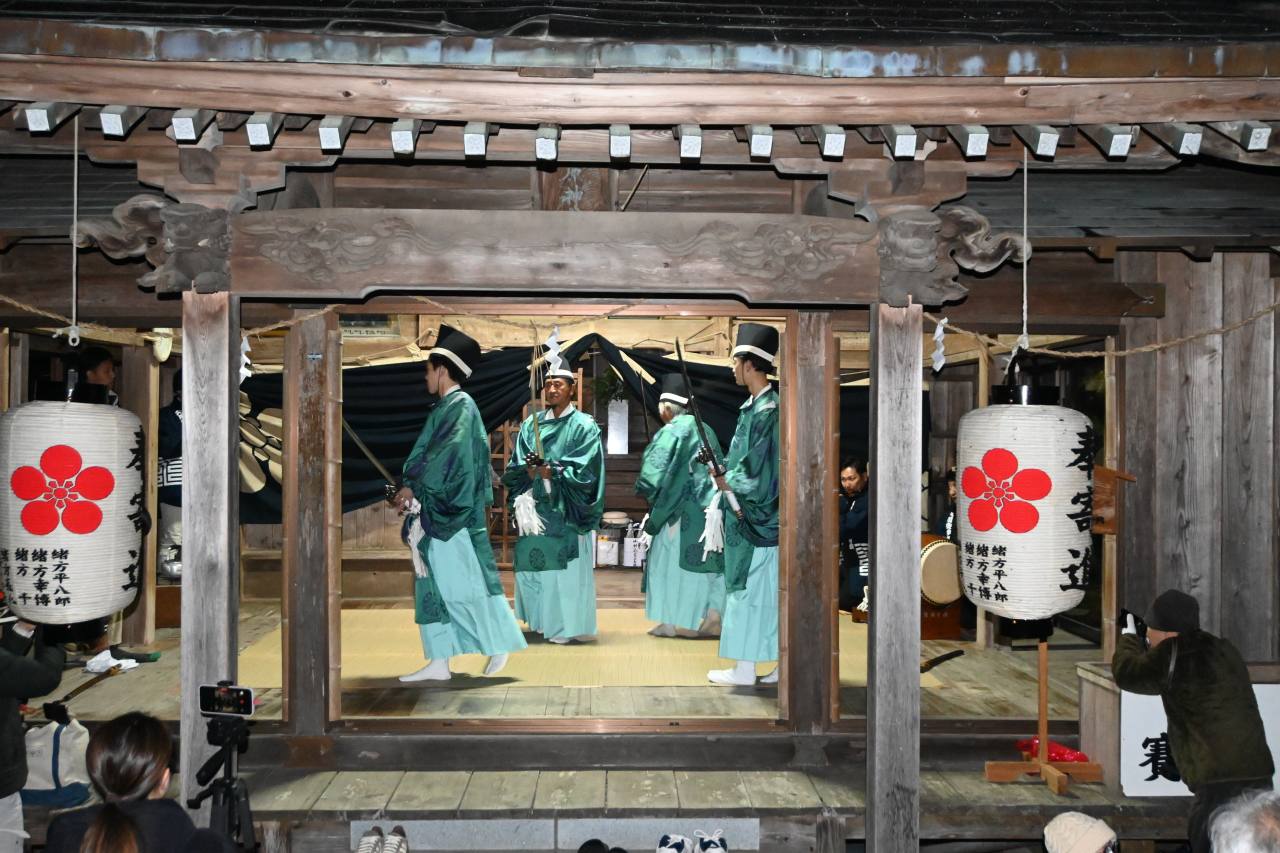 肥後神楽の系統を汲む舞は十座から構成され、榊の舞、御幣の舞、四剣の舞、二剣の舞、弓の舞、弓剣の舞、練の舞、歌神楽、奉剣の舞、鬼神の舞があり、それぞれが1~4人の舞手で舞われます。400年ほど前、江戸時代から伝承されており、現在も地元の保存会により大事に守り伝えられています。