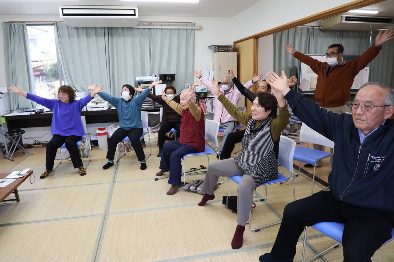 取材当日は公民館で毎月第1、2、3㈭に開かれている100歳体操が行われていました。毎月の開催日は東原だよりを通して周知されています。日によってはスマホ教室や防災教室などが併せて開催されることもあり、地域住民の健康と知識の向上につながっています。