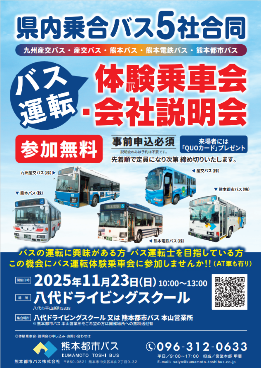 県内バス事業者5社が集結し合同説明会・バス運転体験乗車会が開催されます。バスの運転に興味がある方、バス運転士を目指している方、この機会にぜひご参加ください。