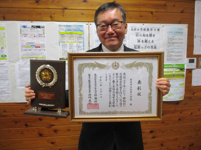 4月3日(金)に、本校が「熊本県警察本部長及び熊本県交通安全協会長による連盟表彰」に選出され菊池市ふるさと創生市民広場にて表彰を受けました。熊本県内では「交通安全優良学校」として4校が選ばれ、そのうちの1校が花房小とのことです(菊池警察署管内では花房小が1校)。保護者様・地域の皆様におかれましては、日頃の子どもたちへの交通安全の見守りをいただき、誠に感謝いたしております。今後ともご協力のほど、どうぞよろしくお願いいたします。