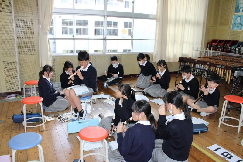 校舎内を歩いていると、鍵盤ハーモニカやリコーダーの音色が聞こえてきました。音楽室へ行ってみると、5年生みんなで合奏練習をしていました。パートごとに練習したり、みんなで合わせて演奏したりと、みんなで力を合わせて頑張るいい雰囲気につつまれていました。いい音色といい雰囲気を感じることができ、とても癒されました。これからも力を合わせて頑張ってください!
