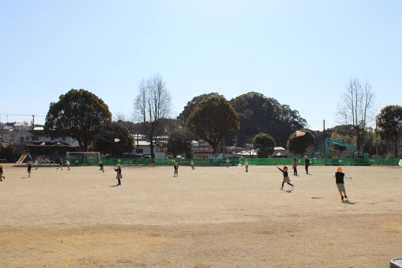 職員室の窓から何やら動くものが見えたので外をのぞいてみると、1年生の凧揚げが行われていました。天気も良くちょうどよいぐらいの風が吹き、まさしく「凧揚げ日和」。子どもたちの楽しそうな声が運動場に響いていました。