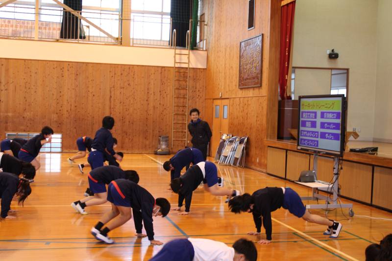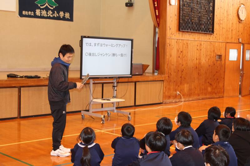 今日は中学校の先生に来ていただき、6年生を対象に授業をしていただきました。中学校の授業がどのようなものであるか、事前に知っておくととても安心します。今回は体育の授業でした。菊池北中の体育の時間に行っている「サーキットトレーニング」に挑戦しました。最初は戸惑いがちでしたが、慣れてくると生き生きと体を動かすようになり、最後はみんな笑顔で授業を受けていました。次はリレーのバトンパスの学習をしていただきます。次の時間もですが、中学校生活が楽しみになりましたね!