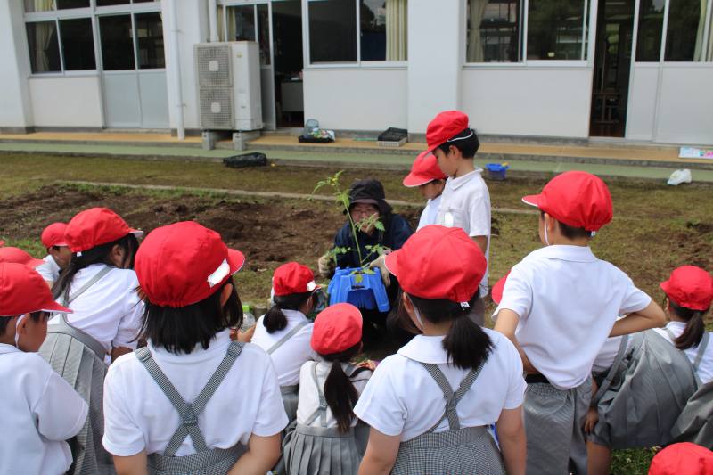 2年生では生活科の時間に「ぐんぐんそだて わたしの野さい」という学習をしています。さっそく、鉢や畑にミニトマトやキュウリの苗を植えました。これから毎日水をかけたり観察したりしていきます。野菜が生長していく様子を2年生みんなで楽しみたいです。