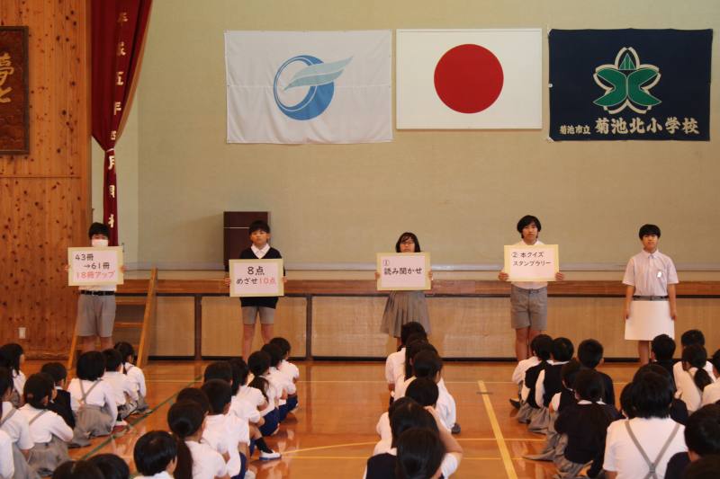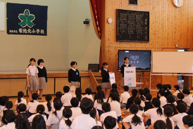 今日は10月の児童朝会の日です。ハートフル委員会から「マイナス思考からプラス思考へ」という気持ちの持ち方の提案がありました。図書委員会からは本の貸し出し状況や図書室の使い方について話がありました。発表の仕方が工夫してあり、みんながしっかり聞くことができました。ハートフル委員会・図書委員会の皆さん、ありがとうございました!