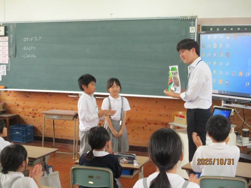 3年生の教室に教育実習の先生が来て早や2週間。いよいよ今日が最終日!今日は3年生と一緒にお楽しみ会をしました。2週間一緒に過ごしたので、ずいぶんと仲良くなっていて、お楽しみ会も盛り上がっていました。最後に、3年生のみんなからメッセージのプレゼントがありました。お別れするのはさみしいですが、次は先生になって、また学校で会いたいものです。先輩、ありがとうございました!