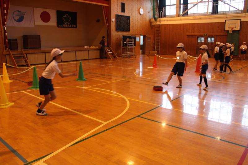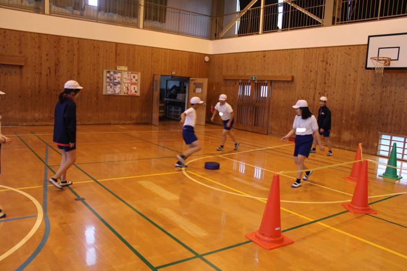 各学年の時間割を見ると、5年生の時間割に「スフェリカルシュート」という内容があったので、何だろうと思い体育館に行ってみました。すると平べったい円形のクッションのようなものを子どもたちがパスをして楽しんでいました。小学校体育のゴール型ゲームではサッカーやバスケットボールをよくするのですが、このボールのようなクッションだと扱いやすく誰もができそうだと思いました。教材・教具の工夫に感心しました。どのように学習が進んでいくか楽しみです!