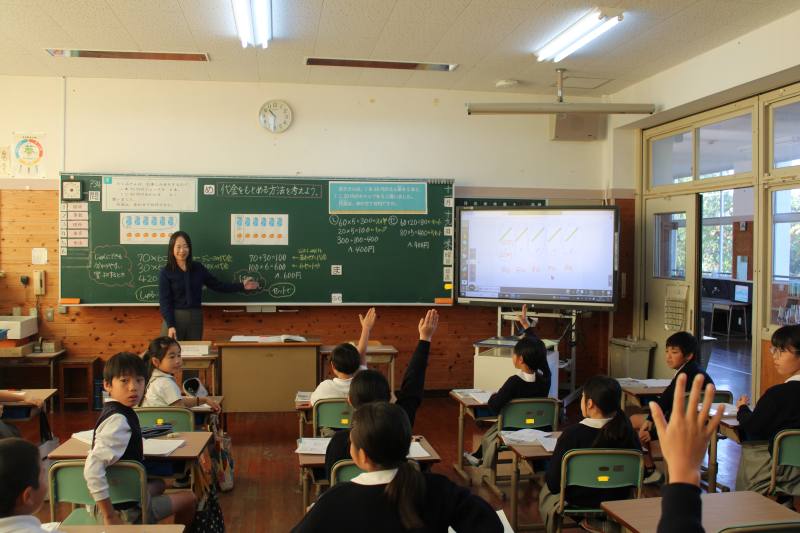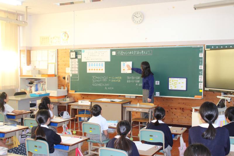今日は3年生で算数の研究授業が行われました。70円のジュースを6本と30円のみかんを6個買った時の代金を求める学習です。「種類ごと」と「セット」の2通りの求め方が子どもたちから出され、それぞれの良さを発表することができました。「次の時間は1つの式で求めるよ!」と先生が言うと「やった~!」とやる気にあふれた返事が返ってきました。次の時間が楽しみですね!