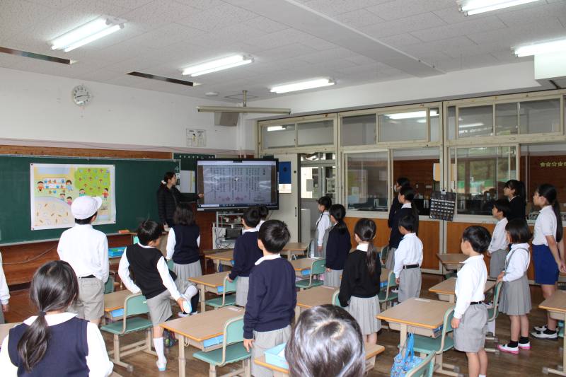 菊池北小学校では、朝の健康観察の後に「朝活動」という時間を設けています。読書をしたり、国語や算数の学習をしたりと、各学年・曜日によって内容は変わってきます。1年生の教室では校歌の練習をしていました。6年生も一緒になり、元気よく歌う姿がとてもよかったです。