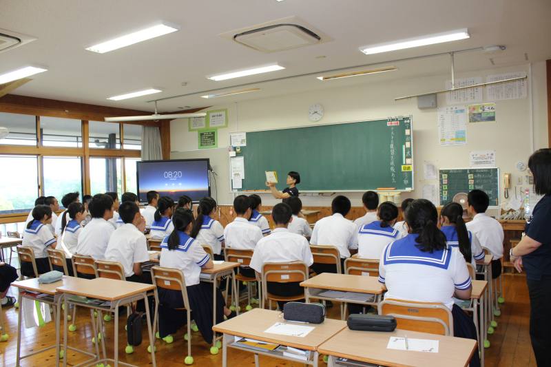 本校では年に4回、全校生徒対象に読み聞かせ活動を行っています。朝の時間に20分間、選書については、ボランティアの方がされています。語り部については、お仕事の話や貴重な体験談などの話をして頂いています。中学生への読み聞かせはとても珍しい活動です。小学生の時とは違う中学生ならではの感性で、本の世界に入り込む貴重な時間となっています。読み聞かせだけではなく、「本の紹介(ブックトーク)」や「読書の必要性」についてもお話をしていただいています。