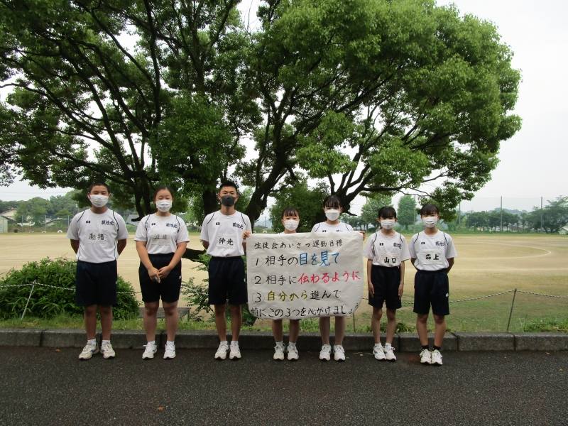 来校者や地域の方に、きちんとした挨拶ができるようにと、生徒会の提案で毎週木曜日、生徒会役員と各委員会で、「あいさつ運動」を行っています。五月は、評議委員会と図書委員会の皆さんありがとうございました。
