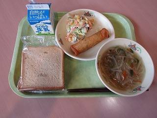 黒糖パン、春雨スープ、春巻き、コールスローサラダ、牛乳