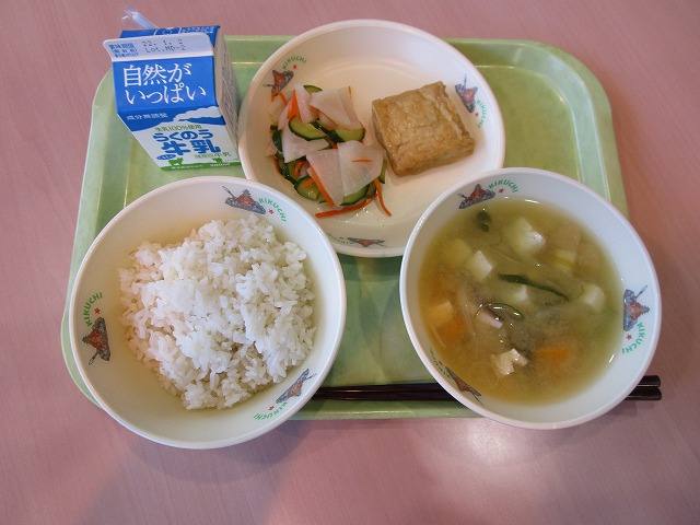 麦ごはん、南瓜の味噌汁、信田煮、ゆず和え、牛乳