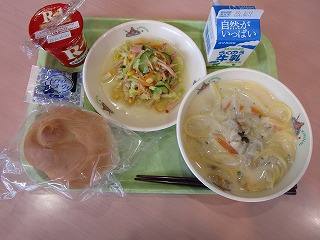 ひのくにパン、スープスパゲティ、アーモンドサラダ、ヨーグルト、ブルーベリージャム、牛乳