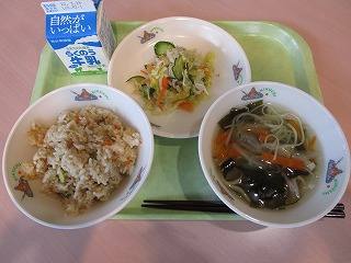 南関揚げ入り混ぜご飯、ふしそうめん汁、切干大根のごまサラダ、牛乳