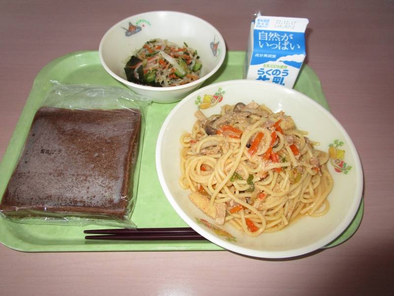 ココアパン、めんたいこスパゲティー、海藻サラダ