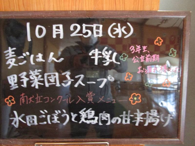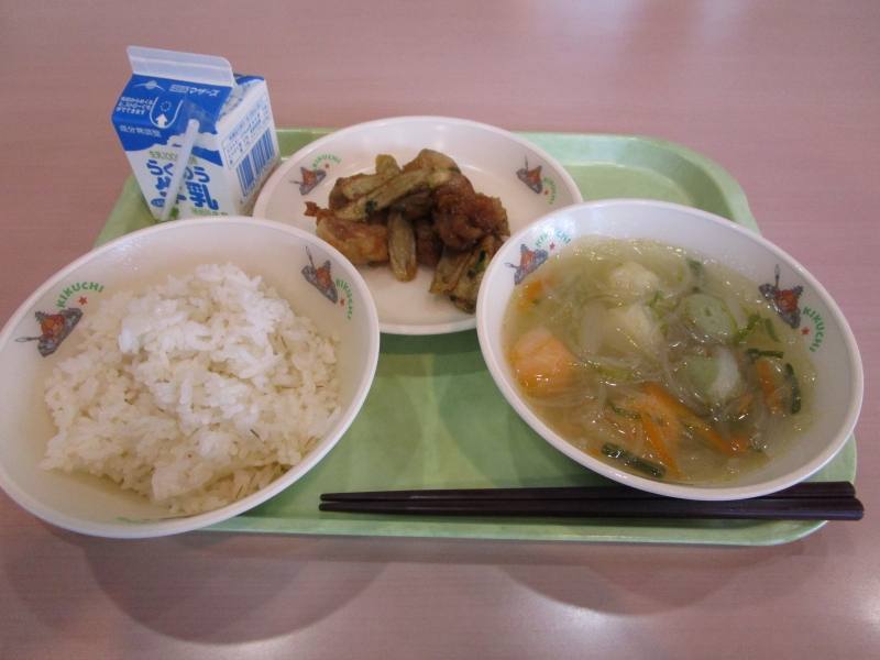 麦ごはん、野菜団子スープ、水田ごぼうと鶏肉の甘辛揚げ