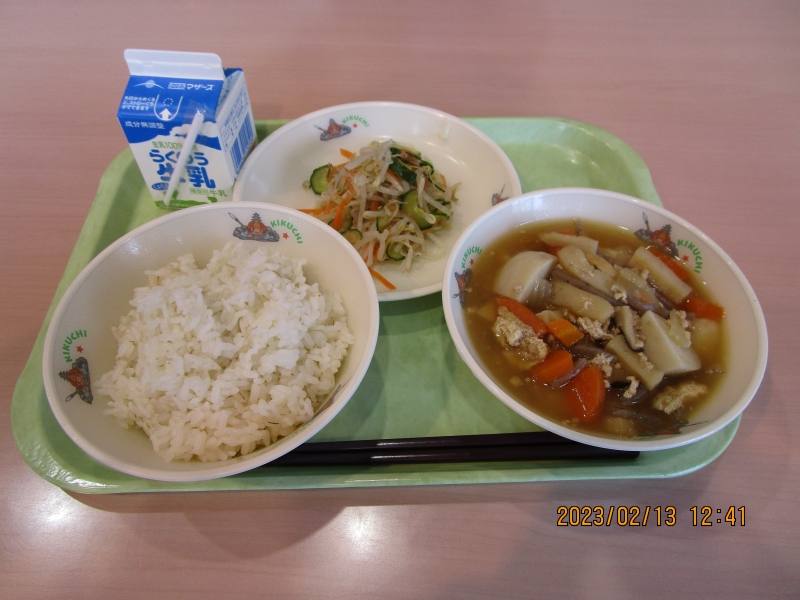 麦ごはん、さといものそぼろ煮、ごまじゃこあえ