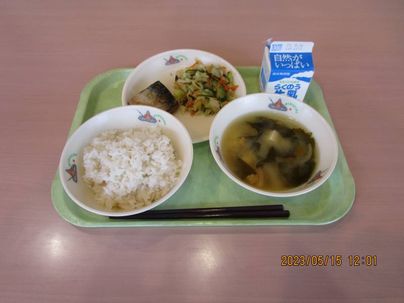 麦ごはん、豆腐のみそ汁、さばの生姜煮、キャベツの昆布あえ