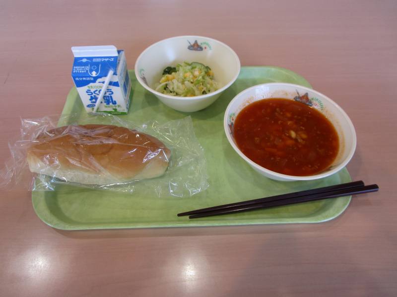 チリコンカン、グリーンサラダ、コッペパン