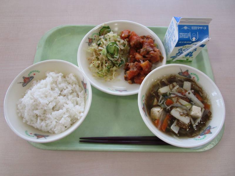 麦ごはん、もずく汁、魚のチリソース、たくわんあえ