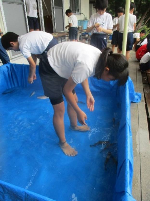 集団宿泊2日目は、室内でヤマメつかみをしました。自分の手で捌き、「命をいただく」ということを実際に体験しました。