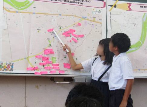 その後、子どもたちは地区ごとに分かれて、自分の地区の危ないところ、安全なところを共有しました。子どもだけでなく、保護者や地区長、地域にお住いの方からも情報を教えていただきました。