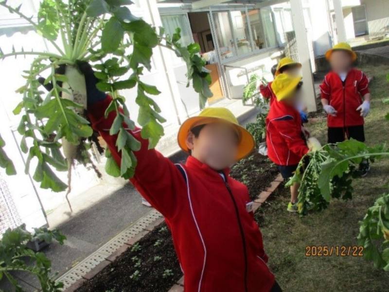 9月から大切に育ててきた大根を引き抜くと、予想以上に大きく育った大根に子どもたちは大喜びでした。