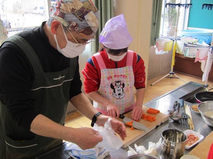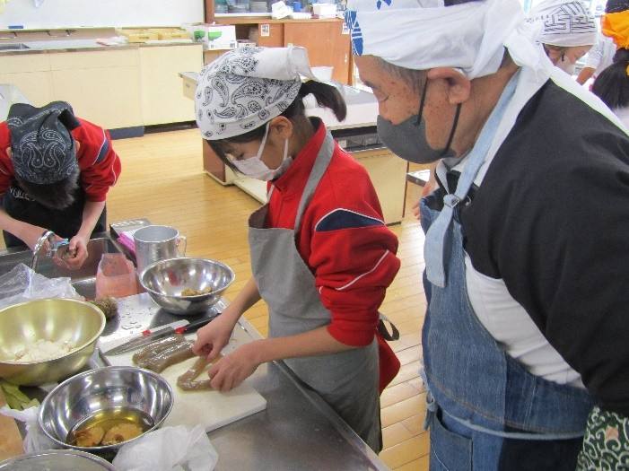 地域の方をお招きし、郷土料理の「のっぺじる」と「だご焼き」作りに挑戦しました。材料の切り方や混ぜ方など、一つ一つの作業を丁寧に教えていただき、協力しながらおいしく仕上げることができました。