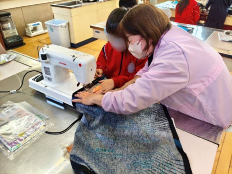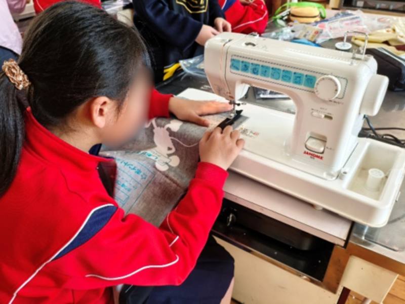 家庭科の学習でエプロンづくりに挑戦しました。地域の方にも来ていただき、ミシンの使い方を教えていただきました。完成したエプロンにみんな嬉しそうにしていました。
