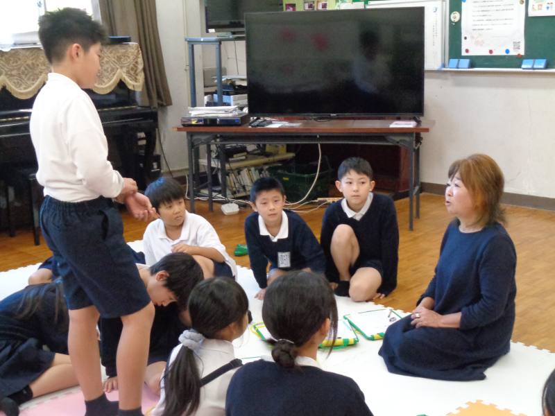 集会所で、信子さんのお話をお聞きしました。お話の中で、人権学習は「人の命を守るための学習」であることを教えていただきました。いじめや差別をなくすためには、相手を憎んだり、やり返したりするのではなく、周りの人の小さな変化に気付き、思いやることが大切だと学びました。話を聞くだけでなく、感想や質問を交わす温かい時間となりました。四年生集会に向けて、なかまを大切にする心を育む学びとなりました。