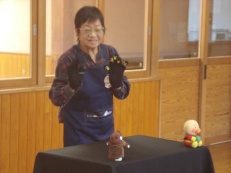 本日は、絵本『わたしのおうち』の”読み聞かせ”と、『だんごだんご』というお話、『からすのおやこ』という手ぶくろ人形でのお話をしていだたきました。