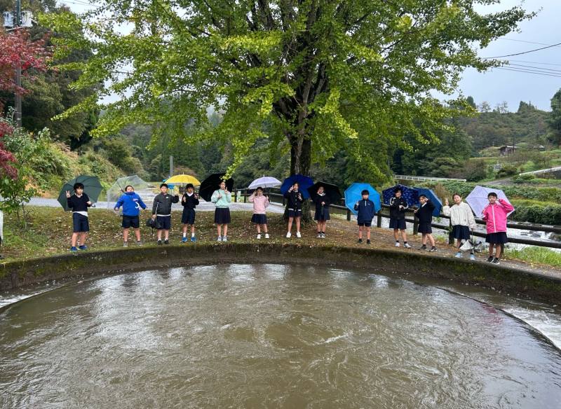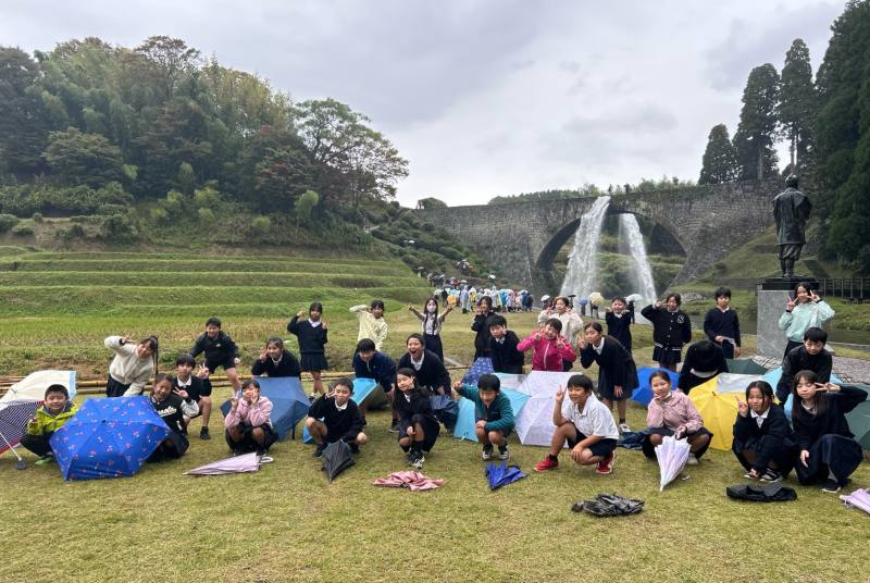 あいにくの雨の中での見学となりましたが、子どもたちは最後まで意欲的に活動しました。通潤橋資料館では、水を台地へ運ぶ仕組みや昔の人々の工夫を学びました。実際に橋を渡ったり放水を見たりして、その迫力に感動していました。午後は円形分水を見学し、水を公平に分ける知恵に「すごい!」と驚いていました。
