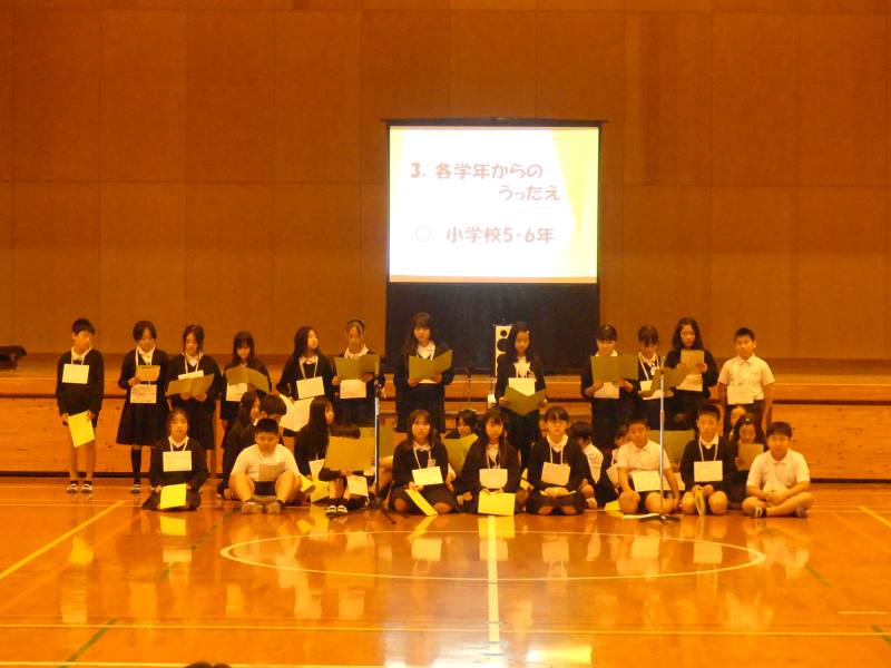 5年生は「水俣学習」、6年生は、「平和学習」、解放子ども会小学部は「狭山現地調査」の学習を通して考えたこと、これから差別をなくしていくために何ができるかを、旭志中学校の生徒の前で発表しました。