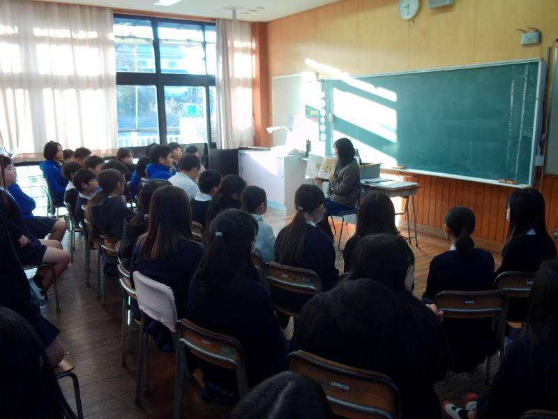 5年生には、『すごいぜ本のちからって!』という絵本の読み聞かせをしました。主人公のネコが、捕まえて食べるはずのネズミに本の読み聞かせをするという、ほっこり心が温かくなる物語です。子どもたちは真剣な眼差しでしっかりとお話を聞くことができました。
