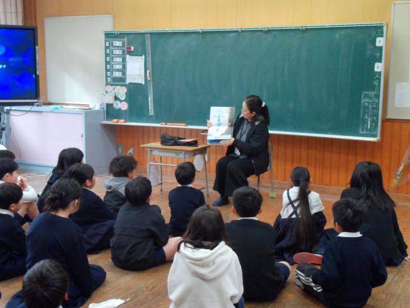 5年生には、東日本大震災をふまえて『じしん・つなみ どうするの?』という大型絵本を選んでいただきました。読み聞かせの方から「地震がきたらどうする?」と子どもたちに問いかけがありましたので、子どもたちは真剣な表情で自分の命を守る方法をしっかりと考えながらお話を聞いていました。