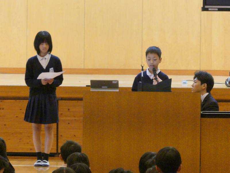 校長先生から、1年間の子どもの頑張りをお話しいただきました。また、4・5年生の代表児童からは、今年度の振り返りと、来年度の決意発表がありました。