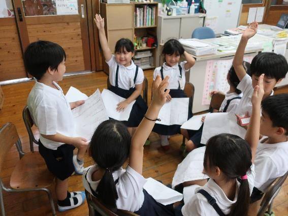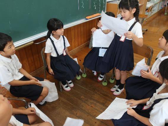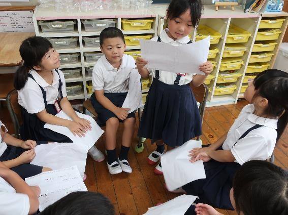 国語「はなしたいな ききたいな」の学習で、夏休みの思い出を書き起こしグループ内で発表しました。相手に聞こえる話し方と相手が喜ぶ聞き方・反応を意識して行い、各グループ内で楽しく発表会ができました。自分の話したいことを最後までぐっと我慢して、しっかり話を聞くことが上手になりました。質問や感想も言うことができるようになってきています。この姿をどんどん伸ばしていきたいと思います。