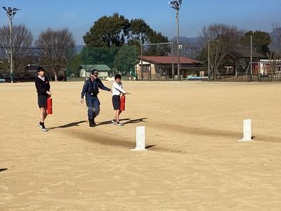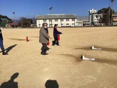 訓練後、水消火器を使って消火訓練も行いました。6年生児童もしましたが、職員も練習させていただきました。