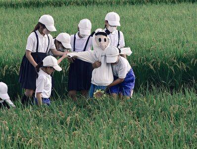 9月19日(金)、5年生が学校田にかかしをたてました。