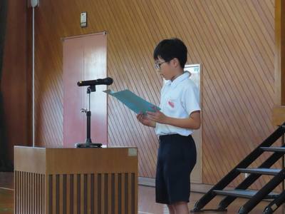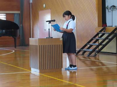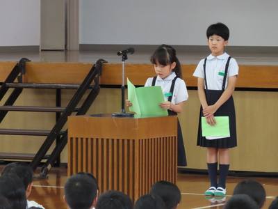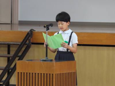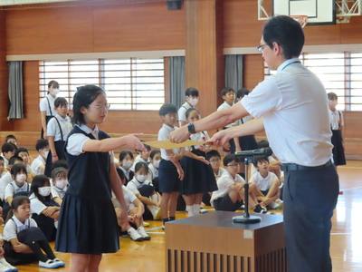 まずは、前期終了式の様子をご紹介します。前期の頑張りの表彰や児童の作文発表がありました。