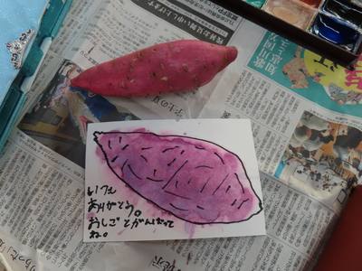 子どもたちは、なす・りんご・さつまいも…などを秋の味覚をじっくり観察しながら、楽しく絵手紙をかいていました。