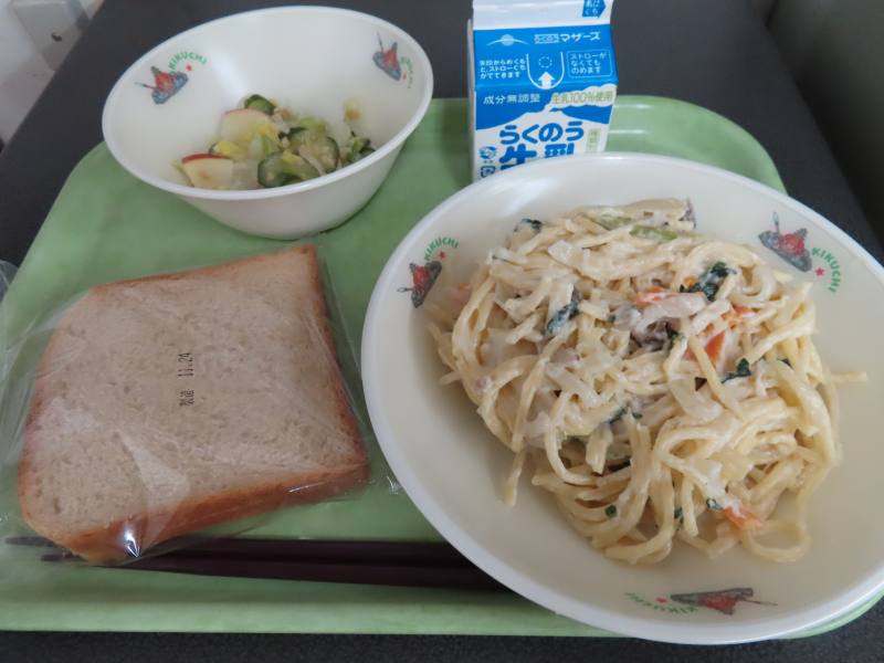こくとうパン クリームスパゲティ はくさいとりんごのサラダ