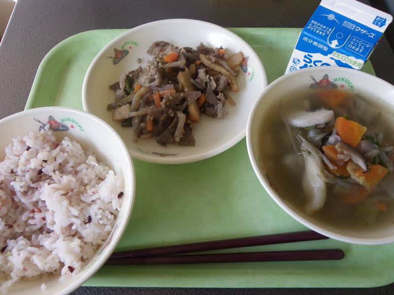 今月は、菊池の特産「古代米」や「りんどうポーク」という豚肉を使った料理です。