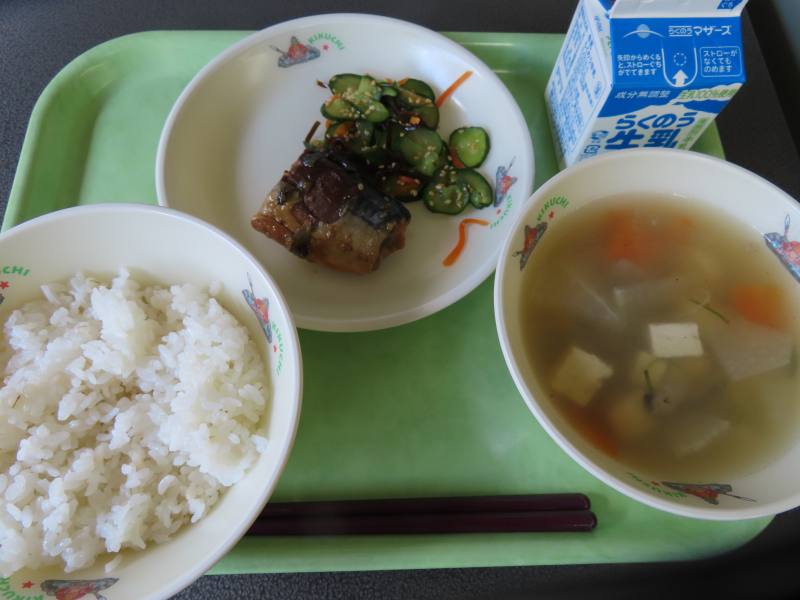 麦ごはん けんちん汁 さばのごまみそ煮 塩こんぶあえ