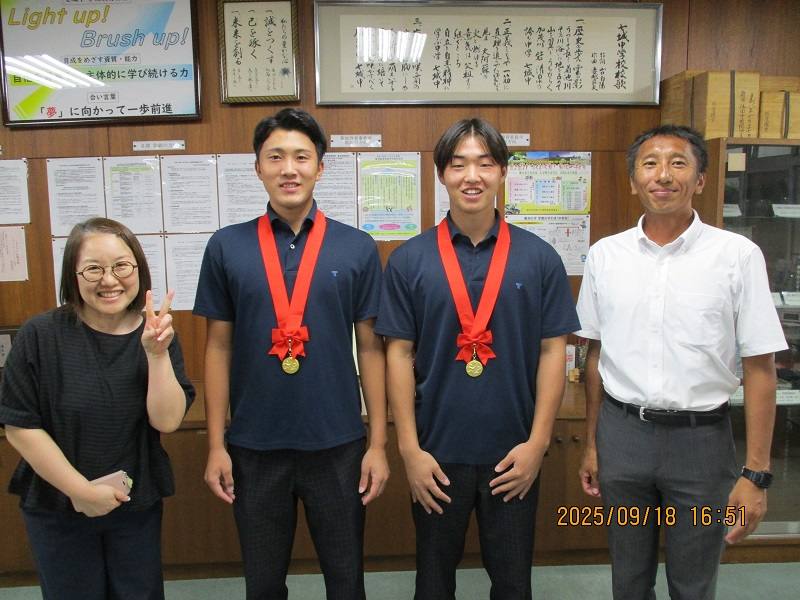 9月18日、東海大学付属熊本星翔高等学校3年、野球部員の 長迫 夏輝 選手が、チームメイトとともに母校七城中に来てくれました。チームメイトは菊池南中出身の堀田選手です。長迫選手と堀田選手は、今夏に行われた第107回全国高等学校野球選手権大会に、熊本県代表として出場し、甲子園で熱いプレーをたくさん見せてくれました。