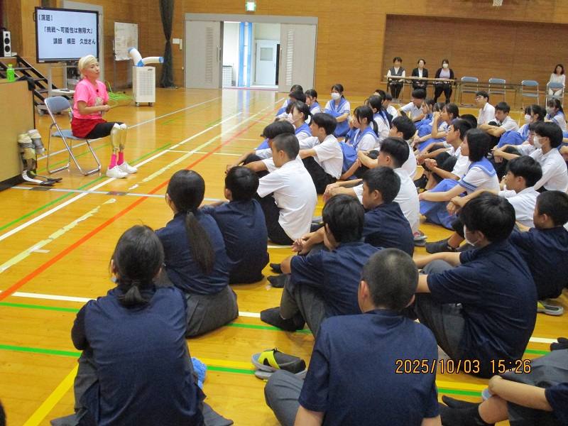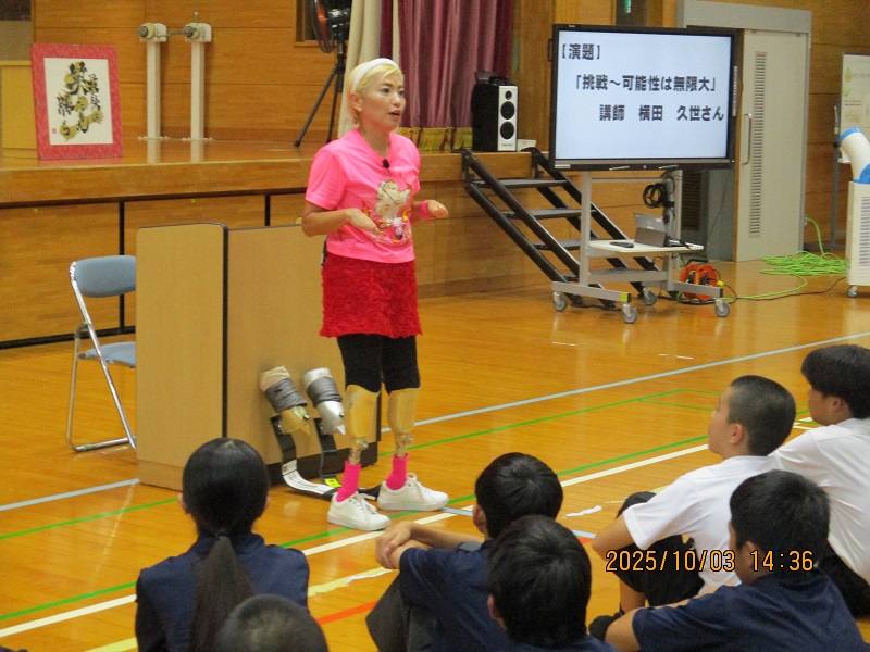 10月3日(金)、教育講演会が行われました。講師は、義足ランナー&ポジティブ番長こと横田久世さん。演題は「挑戦 ~可能性は無限大~」です。横田さんから発せられる言葉はどの言葉も胸に響くものばかりでしたが、中でも特に心に残った言葉を紹介します。