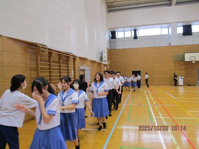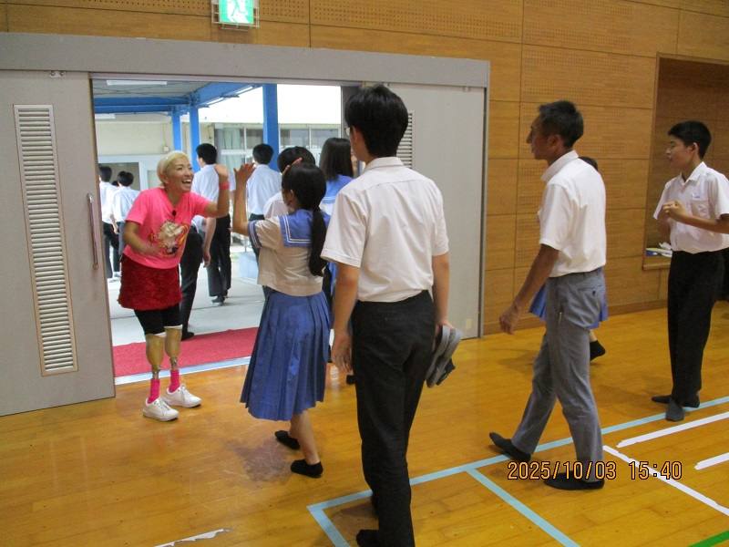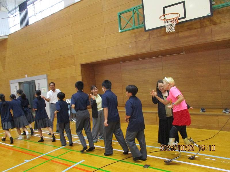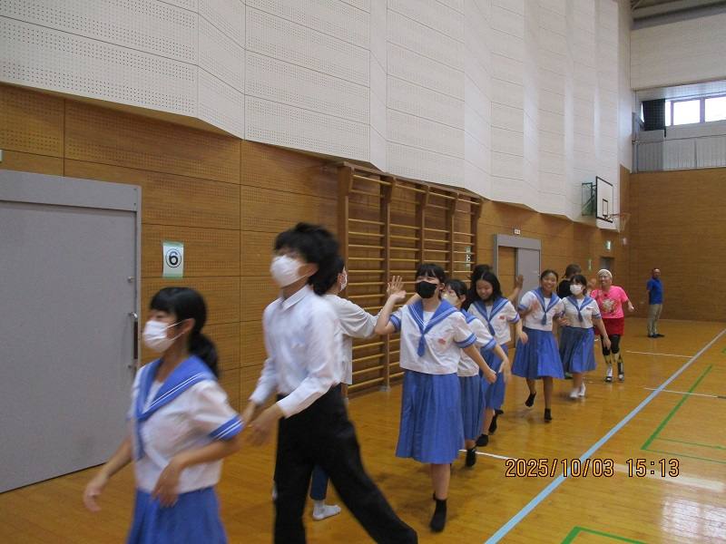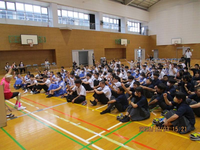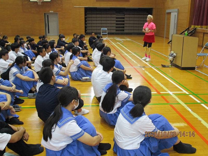 七城中生は、全員顔を上げて横田さんの話に聴き入り、横田さんと一緒に走る場面では、みんなの笑顔が輝いていました。元気が出る講演をしてくださった横田さんに心から感謝いたします。